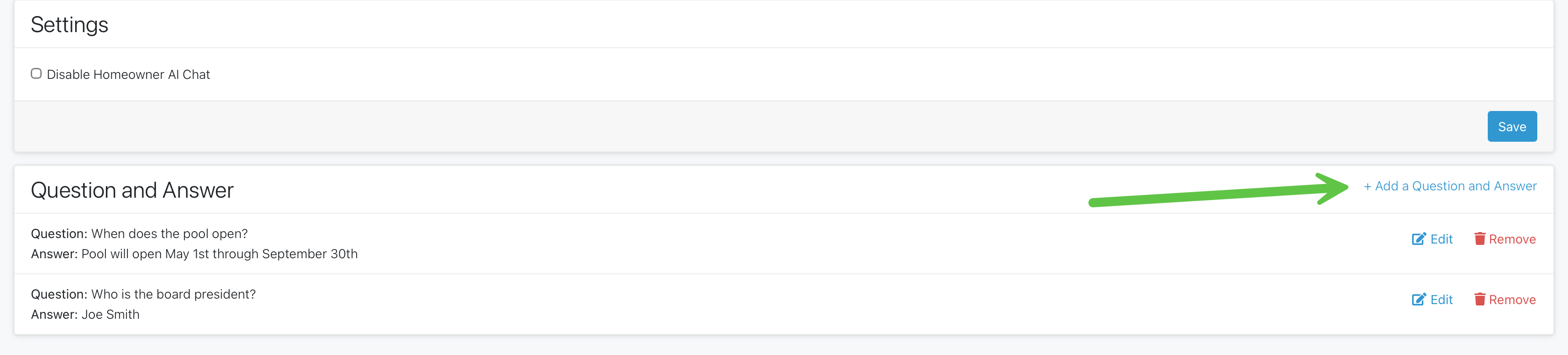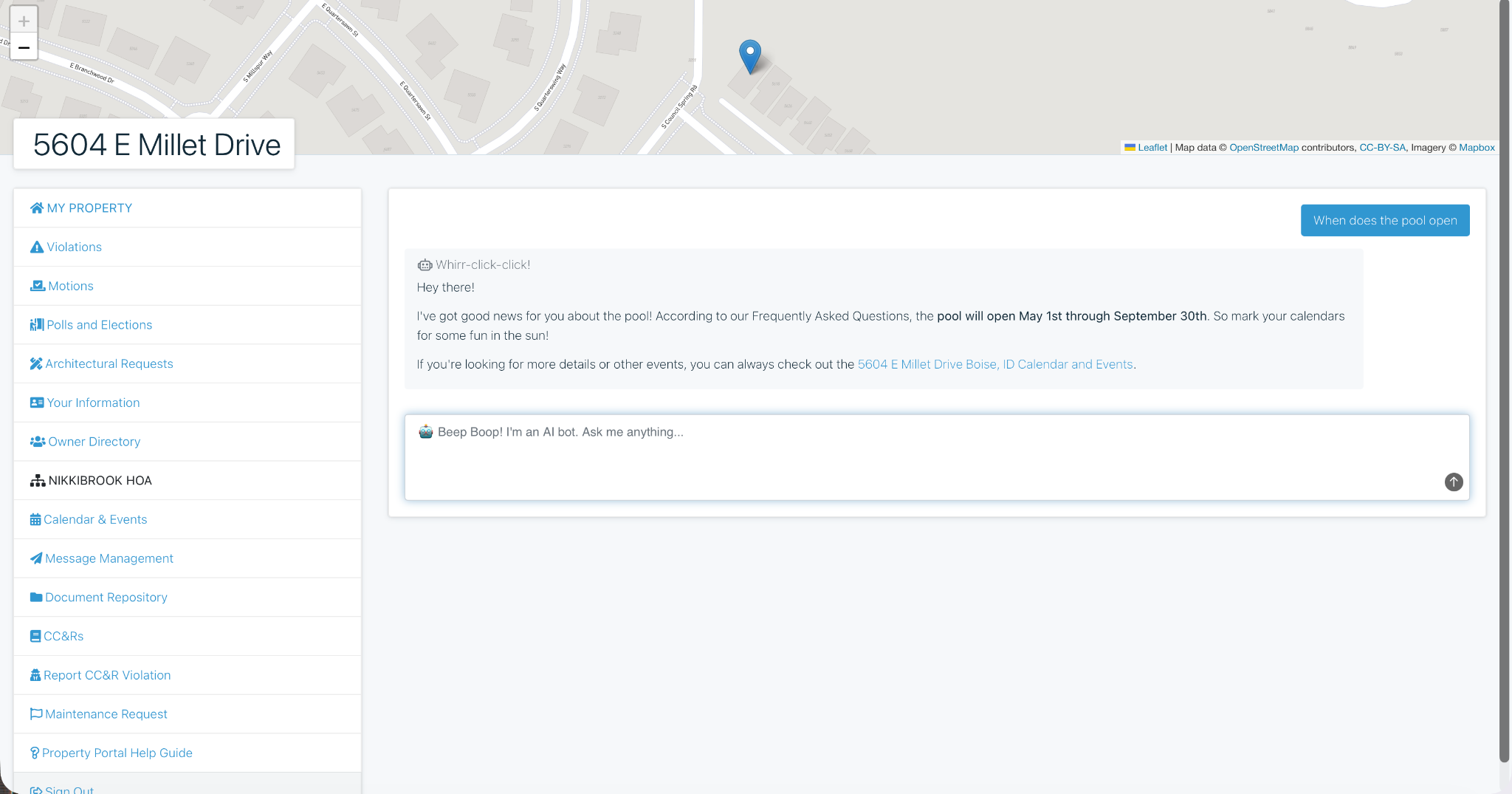You can also enter FAQs for your Association such as when the pool opens, what the annual meeting date is, who your current board members are, what day trash day is, the list can go on and on! Once this information is entered on your settings page, it will be pulled and sent to any owner who asks this question in the chat. This self service chat will allow owners to ask quick questions without taking up space in your inbox.