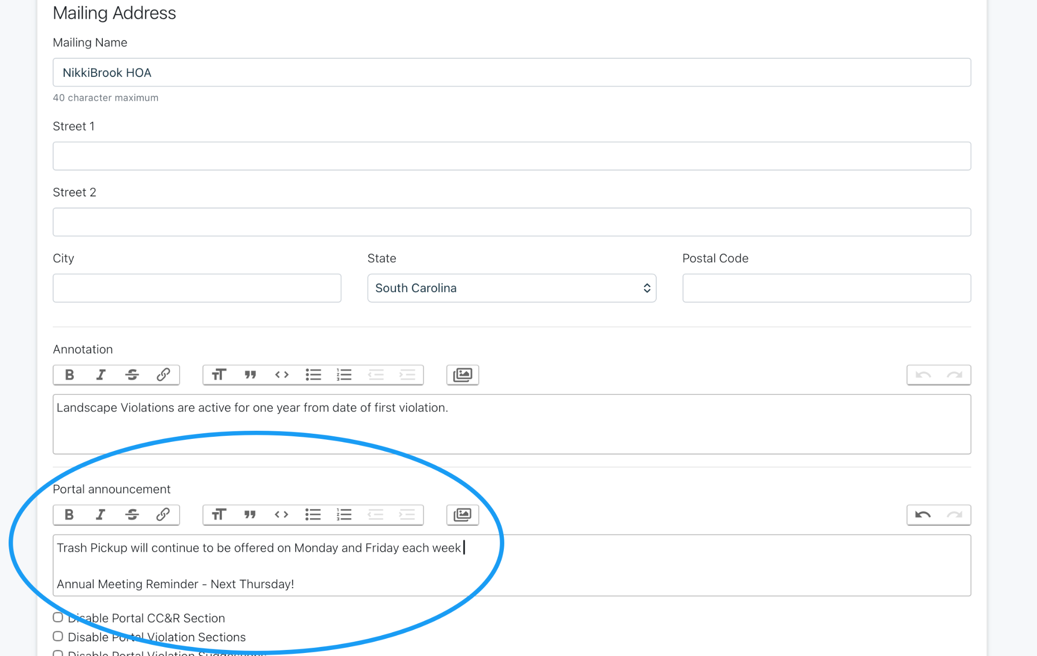 Scroll down to Portal Announcement. From here you can enter the information that you would like to be visible to owners in their portal. Note - Annotation is what is visible in your HOALife Dashboard for Users only.