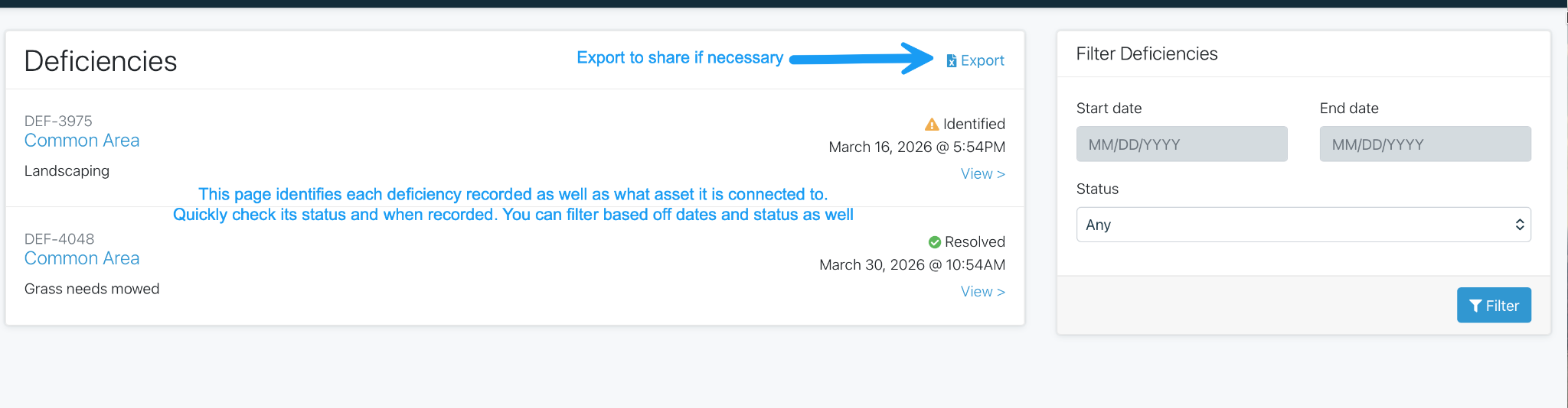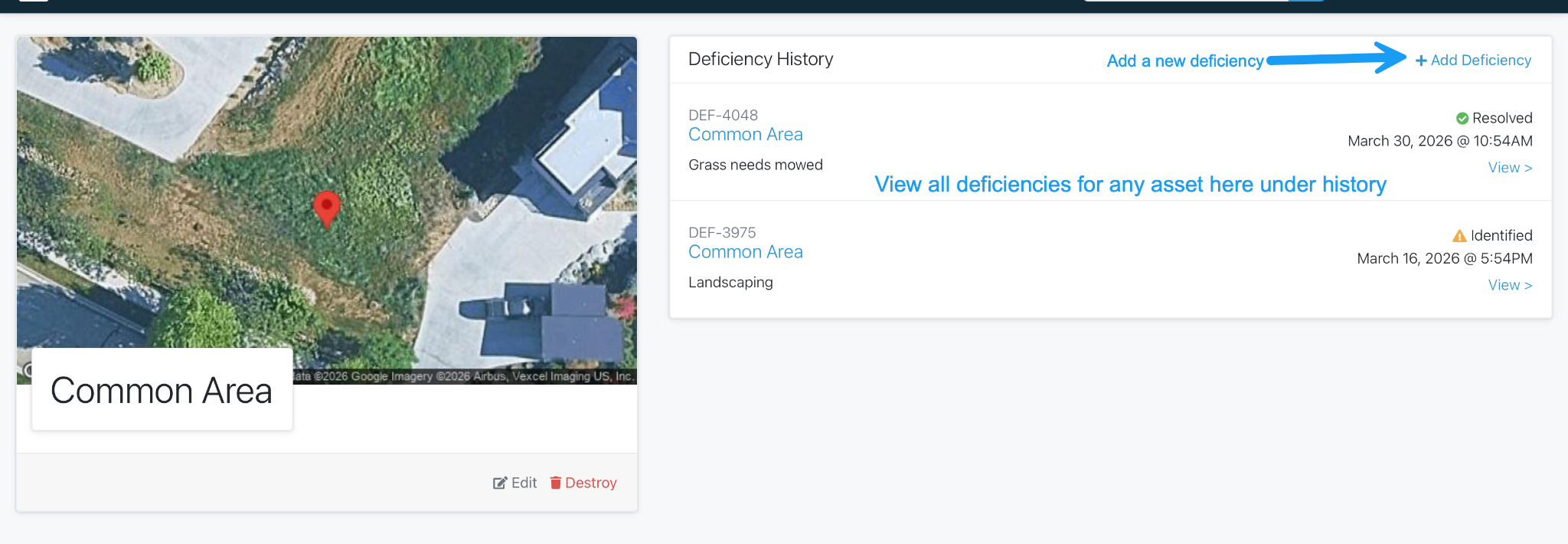 Deficiencies are issues that are noted about Assets either during an Inspection or from the Dashboard. What a Deficiency is to an Asset, a Violation is to a Property. Generally the HOA, rather than an individual property owner, is responsible for the resolution of a Deficiency.