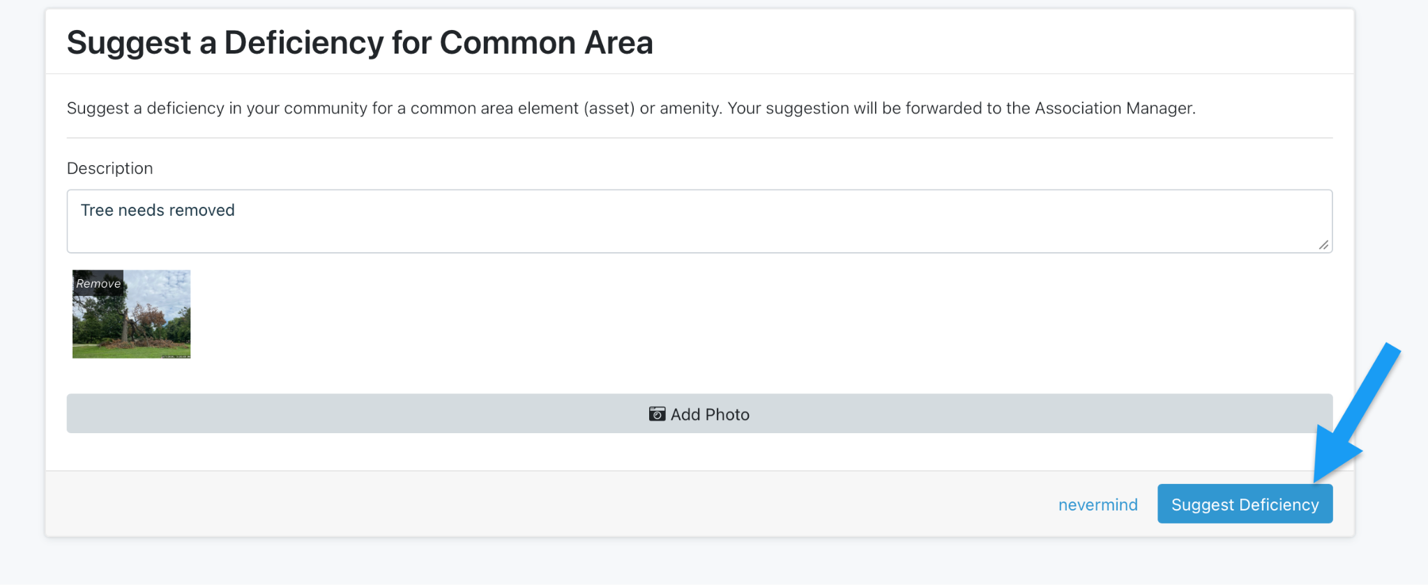 Owners can also submit deficiencies from their owner’s portal by navigating to the “Maintenance Request” link. Dashboard users can then determine the legitimacy of these deficiencies and respond appropriately by converting this suggestion to a deficiency or choosing to ignore what has been submitted if it is a duplicate or not an HOA responsibility.
