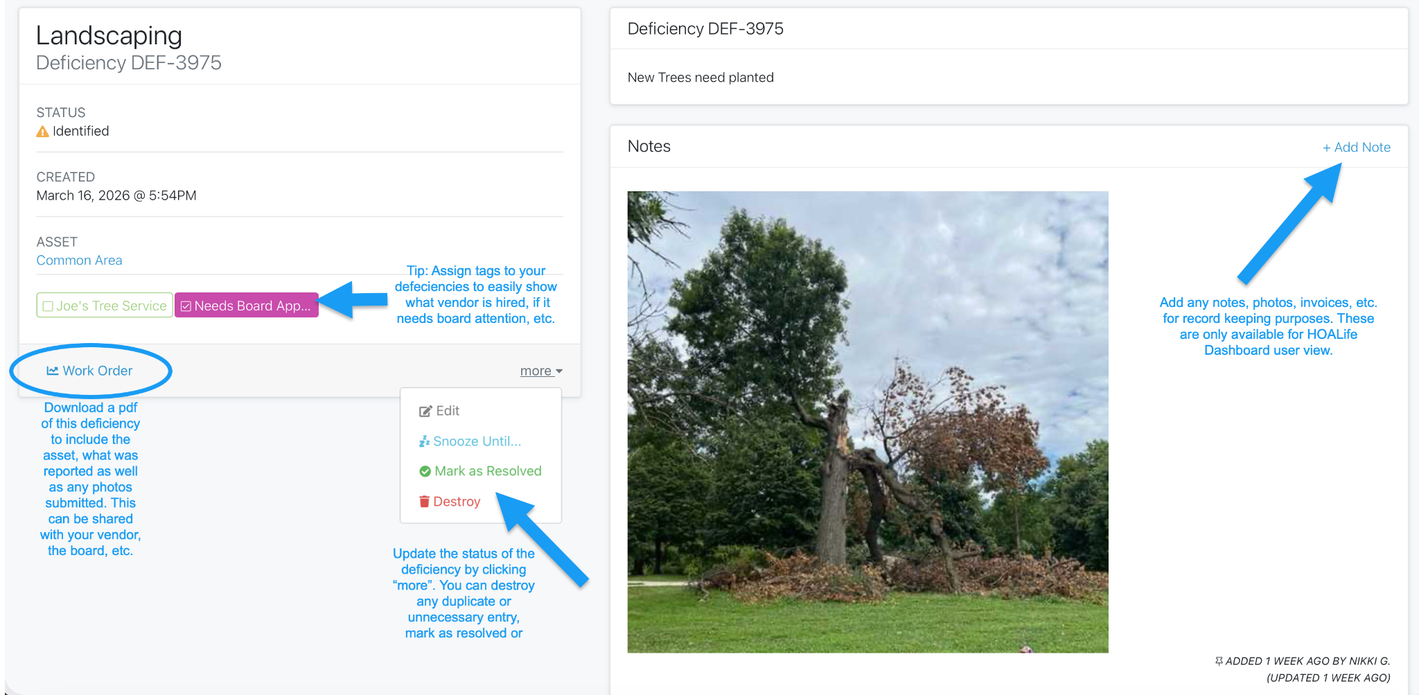 Once a deficiency is noted on an asset, you can easily create a work order. A work order can be viewed by any HOALife Dashboard User as well as downloaded as a pdf or spreadsheet and shared with the Board of Directors, Maintenance Personnel, or Vendor. This also creates a record of requested repairs reported or completed for an asset that can later be referenced for any historical purposes, insurance claims, owner requests, etc.