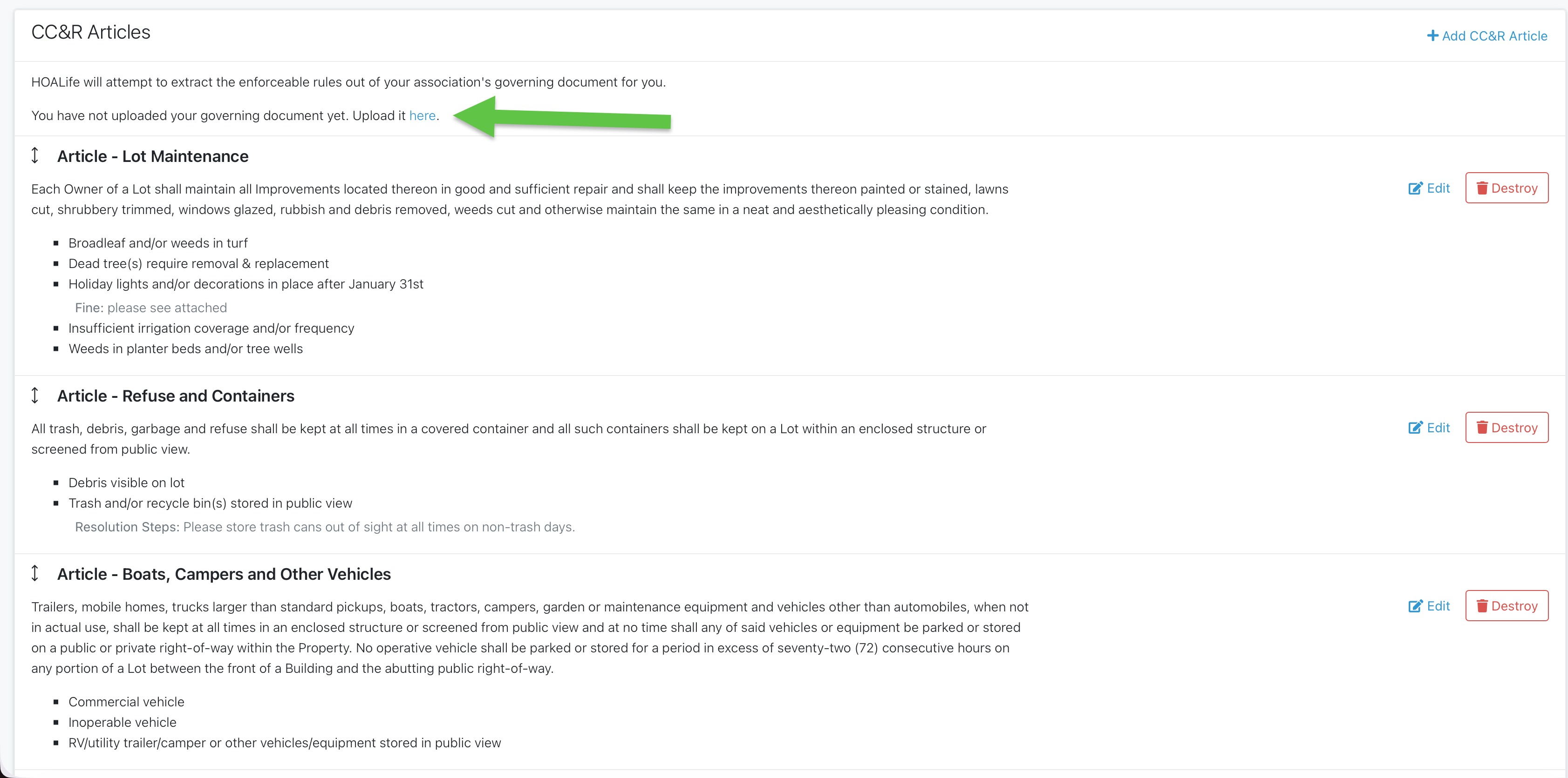 You can also choose to upload a pdf file of your CC&Rs and the system will use AI to scan your governing documents to upload each rule. You will have the ability to choose which rules are imported, as well as edit what is shown. This gives you the flexibility to ensure that the CC&R's reflected are correct for your Association and will be ready for your next inspection. Note: Uploading does not remove the stock articles. You will need to destroy the articles that do not work for you.